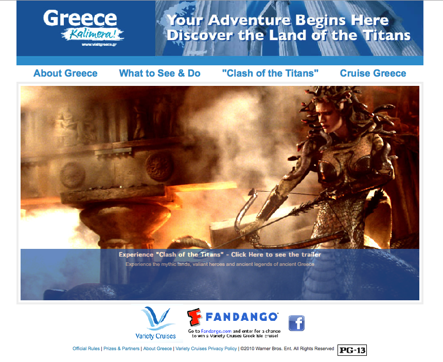 Greece is a land of ancient, mythical gods, and in 2010, for the Warner Bros. movie, “Clash of the Titans,” I created a cross-promotional sweepstakes online ad where people could view the movie trailer and enter to win a trip to Greece, including a tour with Variety Cruises. This is one example of the multiple ads that were created for the campaign.