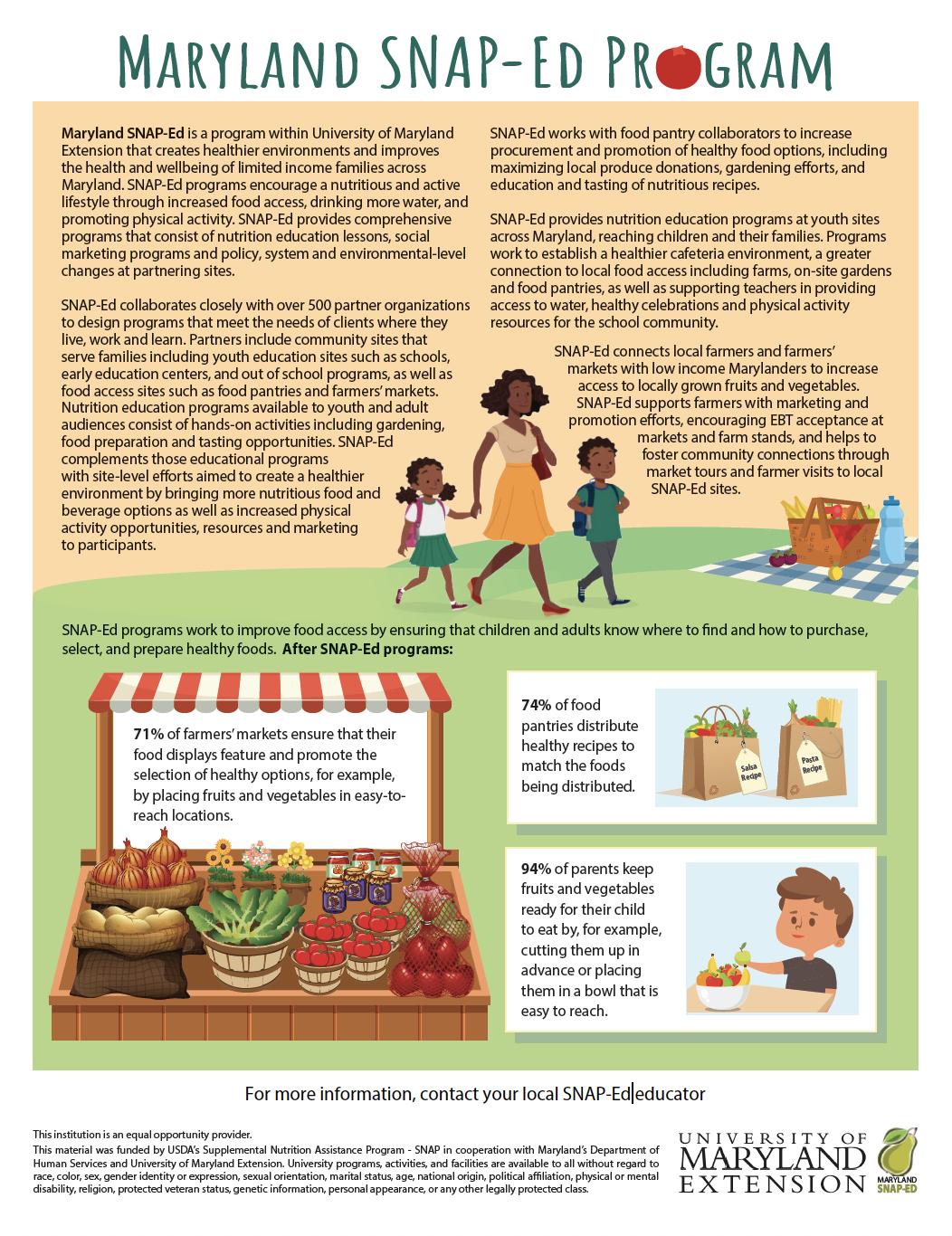 MD SNAP-Ed collects vital data from multiple sources showing how each initiative affects Maryland families in positive ways. Through the use of pleasant color palates and infographics, complex data can be presented in an easily-digestible way.